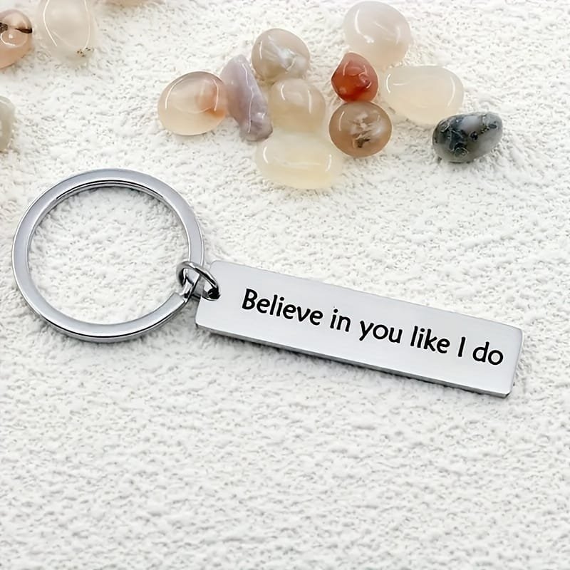 Usu sinusse võtmehoidja - See ei ole mitte ainult funktsionaalne aksessuaar, vaid ka tugev emotsionaalne sõnum, mida saab iga päev kaasas kanda. Graveeritud tekst „Believe in You Like I Do“ sümboliseerib toetust, usaldust ja armastust. See on väike asi, mis muutub võimsaks meeldetuletuseks, et keegi usub sinusse, isegi kui sa selles kahtled.